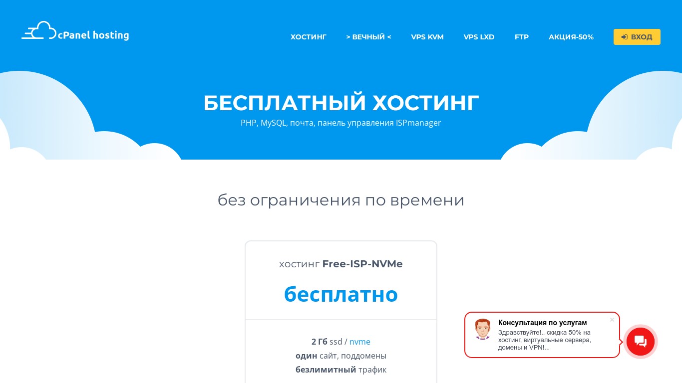 Бесплатный хостинг от CpanelHosting.ru с поддержкой PHP, MySQL, почты, ISPmanager, но со значительными ограничениями. Бесплатный тариф на этом хостинге целиком и полностью не подходит для коммерческих проектов. Нельзя размещать любые сайты компаний, визитки, интернет-магазины, сайты по сбору пожертвований, любые варианты kikstarter, онлайн-биржи, сайты ботов и роботов для социальных сетей и так далее. Такие ограничения делают бесплатный тариф на этом хостинге практически бесполезным, ведь большинство сайтов в интернете создаются для получения прибыли.