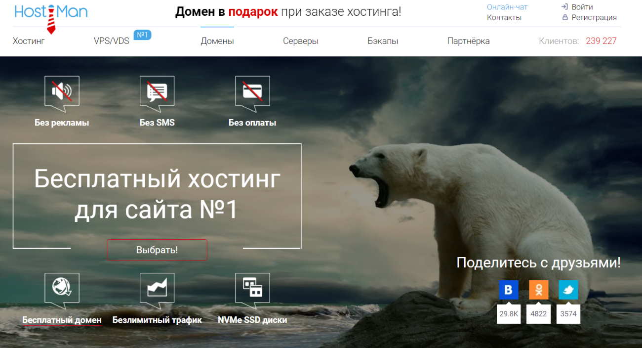 Наш топ возглавит самый популярный бесплатный хостинг рунета: «Хостимен». Для использования хостинга потребуется фото вашего паспорта, это защита от вероятности нелегального использования хостинга. Главные преимущества это отсутствие рекламы, поддержка CloudLinux + ISPmanager 6, выбор версии PHP 5.2 — 8.0, неограниченный трафик, автоматический BackUp, FTP, MySQL, Cron, а так же есть конструктор сайтов и возможность установки CMS WordPress и друге услуги.